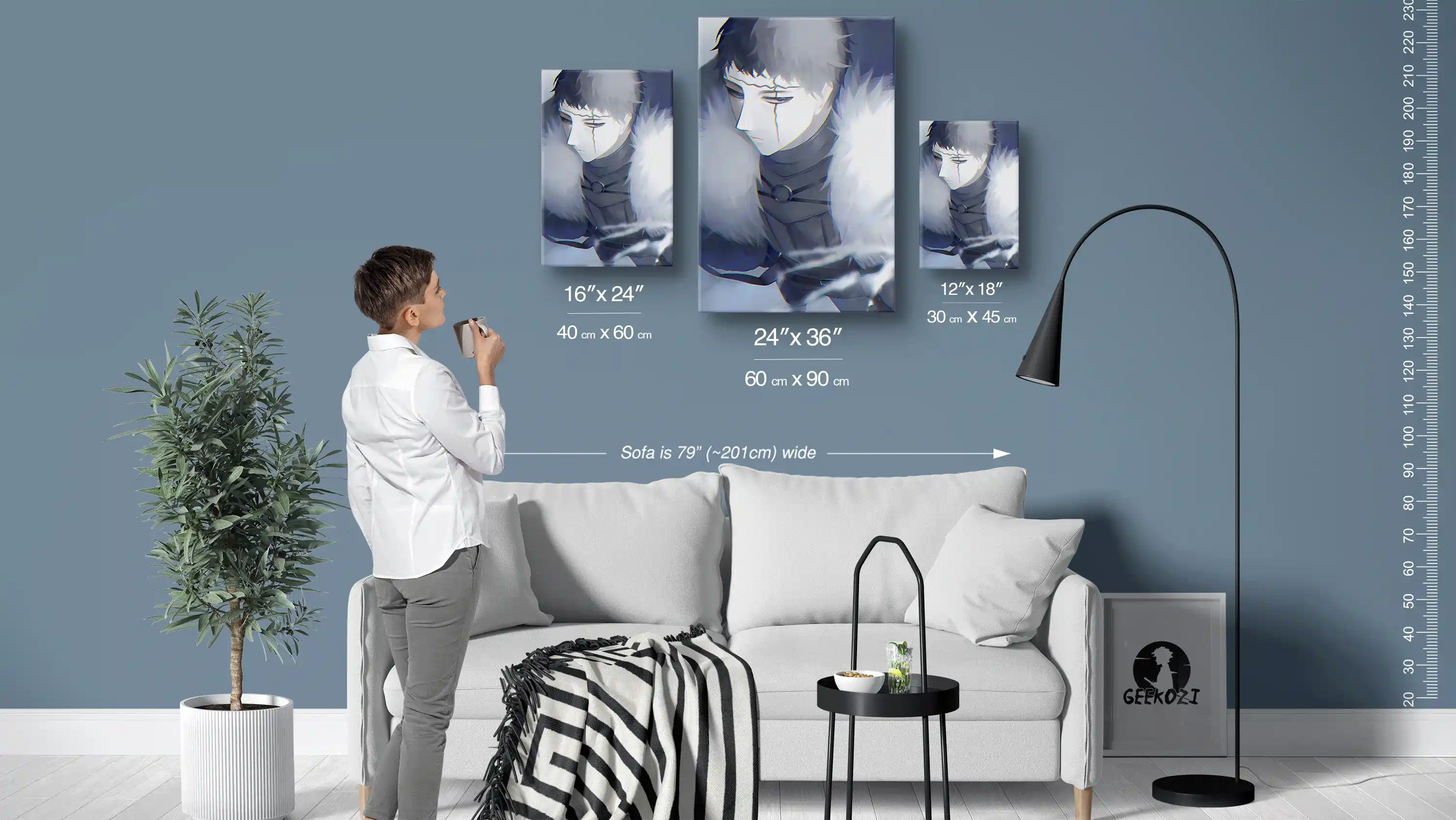 The Somber Bone Magic Confrontation is available in three sizes: 12×18 (30×45 cm), 16×24 (40×60 cm), and 24×36 (60×90 cm), making it easy to find the perfect fit for your space. The sofa shown in the image above is 79 inches wide, so you can get a sense of how each size will look on your wall. A good tip for choosing a size is to consider where you plan to hang it; the smallest option works well for desks, while the largest creates an eye-catching focal point on feature walls.