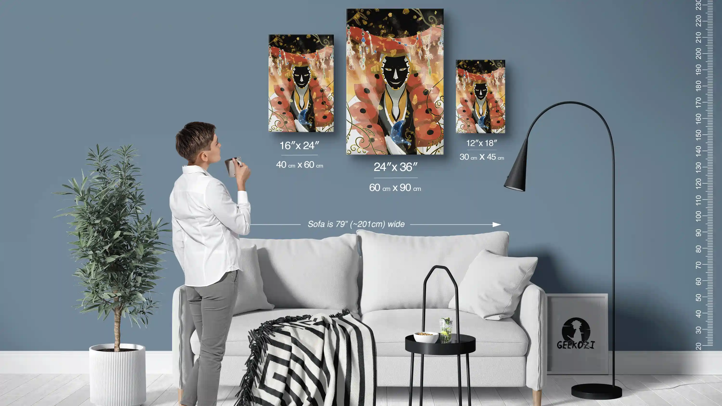The Eccentric Masked Gaze captures attention with its striking design, and it’s available in three panel sizes: 12″×18″ (30×45 cm), 16″×24″ (40×60 cm), and 24″×36″ (60×90 cm). To help you visualize its impact, the sofa in the image above measures 79 inches wide, giving you a reference for scale. For a cozy vibe on smaller surfaces like desks or bookshelves, the 12″×18″ size works perfectly. If you’re looking to make a bold statement on a feature wall, consider opting for the larger 24″×36″ option. Each size adds a unique touch, allowing you to create the atmosphere you desire.