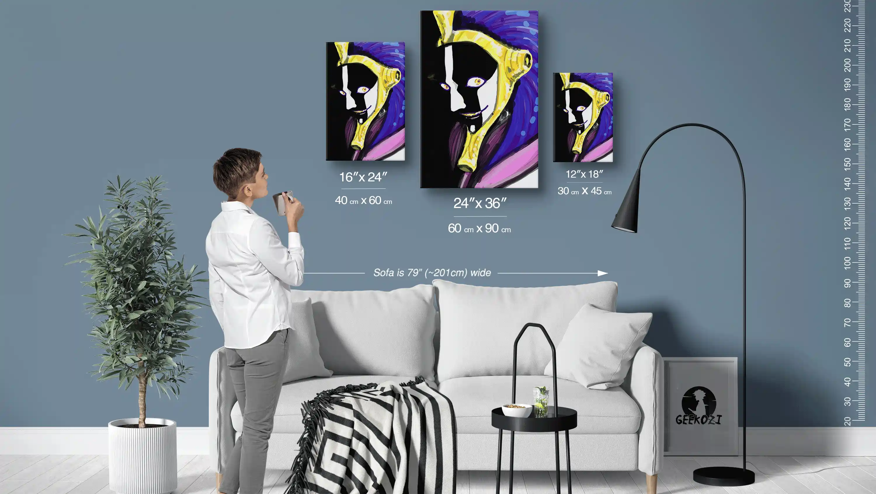 The Electric Golden Headpiece Moment adds a striking touch to any space, available in three panel sizes: 12″×18″ (30×45 cm), 16″×24″ (40×60 cm), and 24″×36″ (60×90 cm). To help you judge the scale, the sofa in the image above measures 79 inches (approximately 201 cm) wide. If you’re looking to decorate a smaller area like a desk or a shelf, the smallest size is ideal. For larger installations that make a bold statement on a feature wall, consider opting for the largest size. This artwork is sure to impress any anime enthusiast.