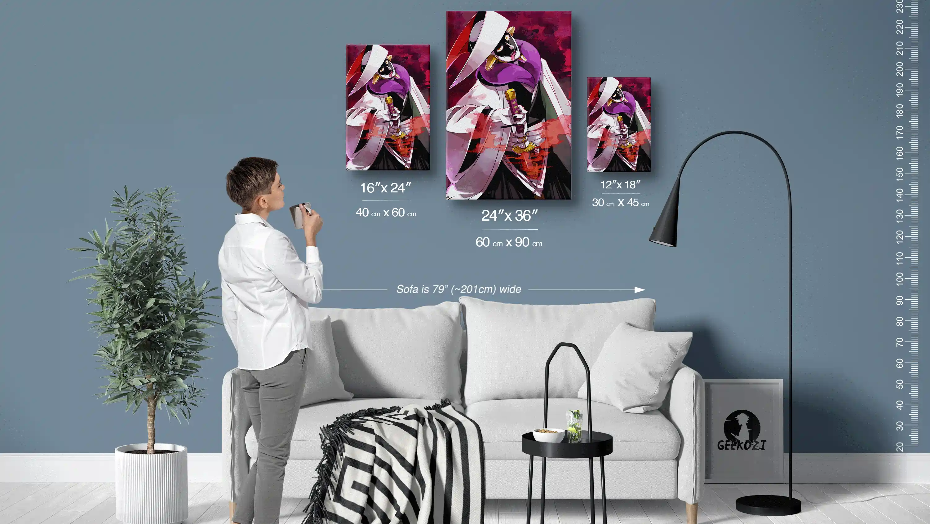 The Intense Aura Looming Stance is available in three captivating sizes: 12″×18″ (30×45 cm), 16″×24″ (40×60 cm), and 24″×36″ (60×90 cm). To help you visualize the perfect fit, the sofa in the image above measures 79 inches (approximately 201 cm) wide. For smaller spaces like desks or cozy nooks, the 12″×18″ option works beautifully, while the 24″×36″ size makes a striking statement on feature walls, drawing attention and creating a stunning focal point. Choose your size based on the area you want to enhance, ensuring it complements your space perfectly.