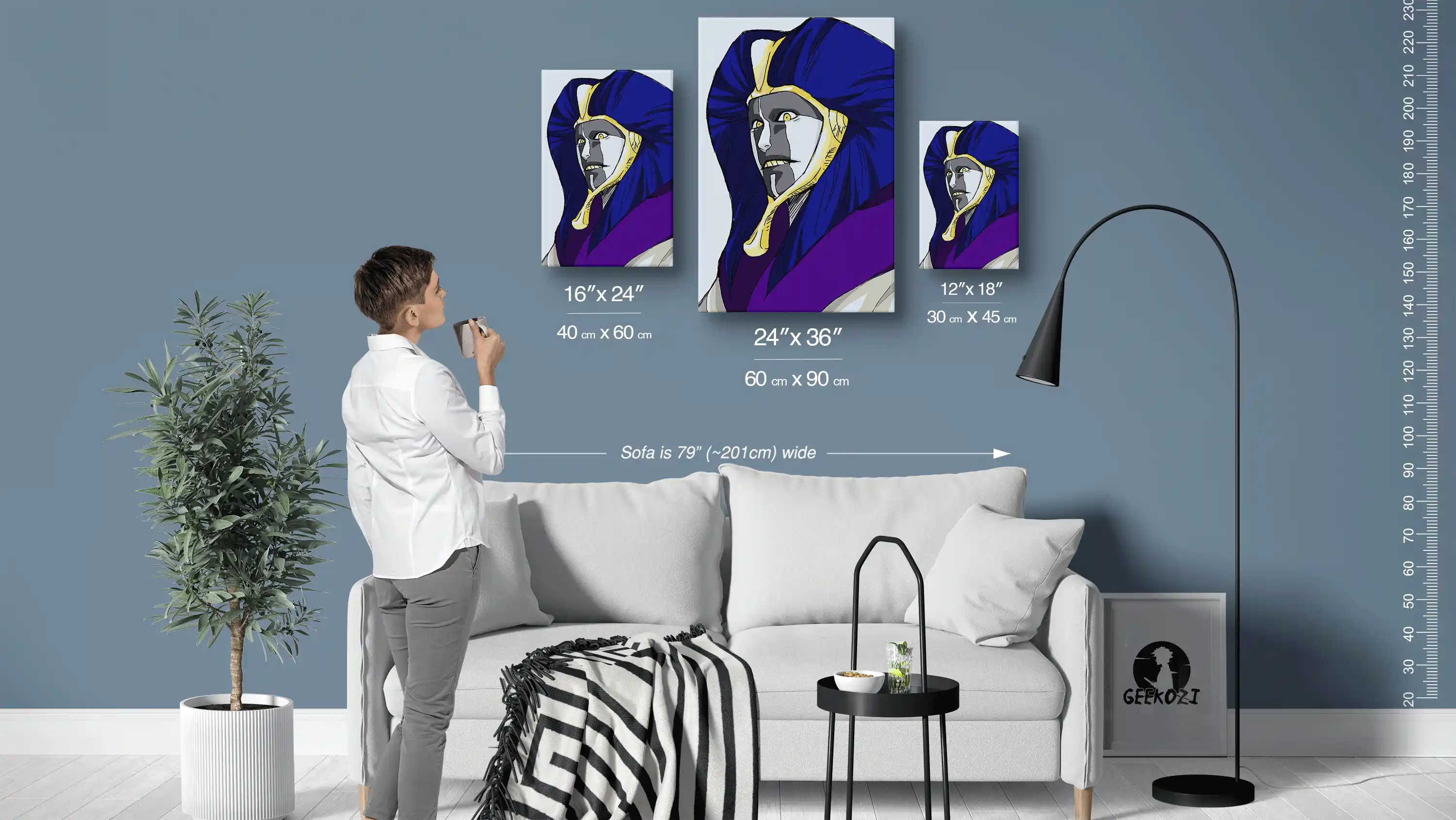 Introducing our stunning Menacing Gaze and Golden Headdress, available in three panel sizes: 12″×18″ (30×45 cm), 16″×24″ (40×60 cm), and 24″×36″ (60×90 cm). To help you visualize the artwork, the sofa shown in the image above is 79 inches (≈201 cm) wide. If you’re looking to add flair to a small space, the 12″×18″ size is perfect for desks or smaller walls, while the 24″×36″ variation makes a bold statement on feature walls. Choose the size that best fits your space to showcase this captivating piece of anime metal wall art.