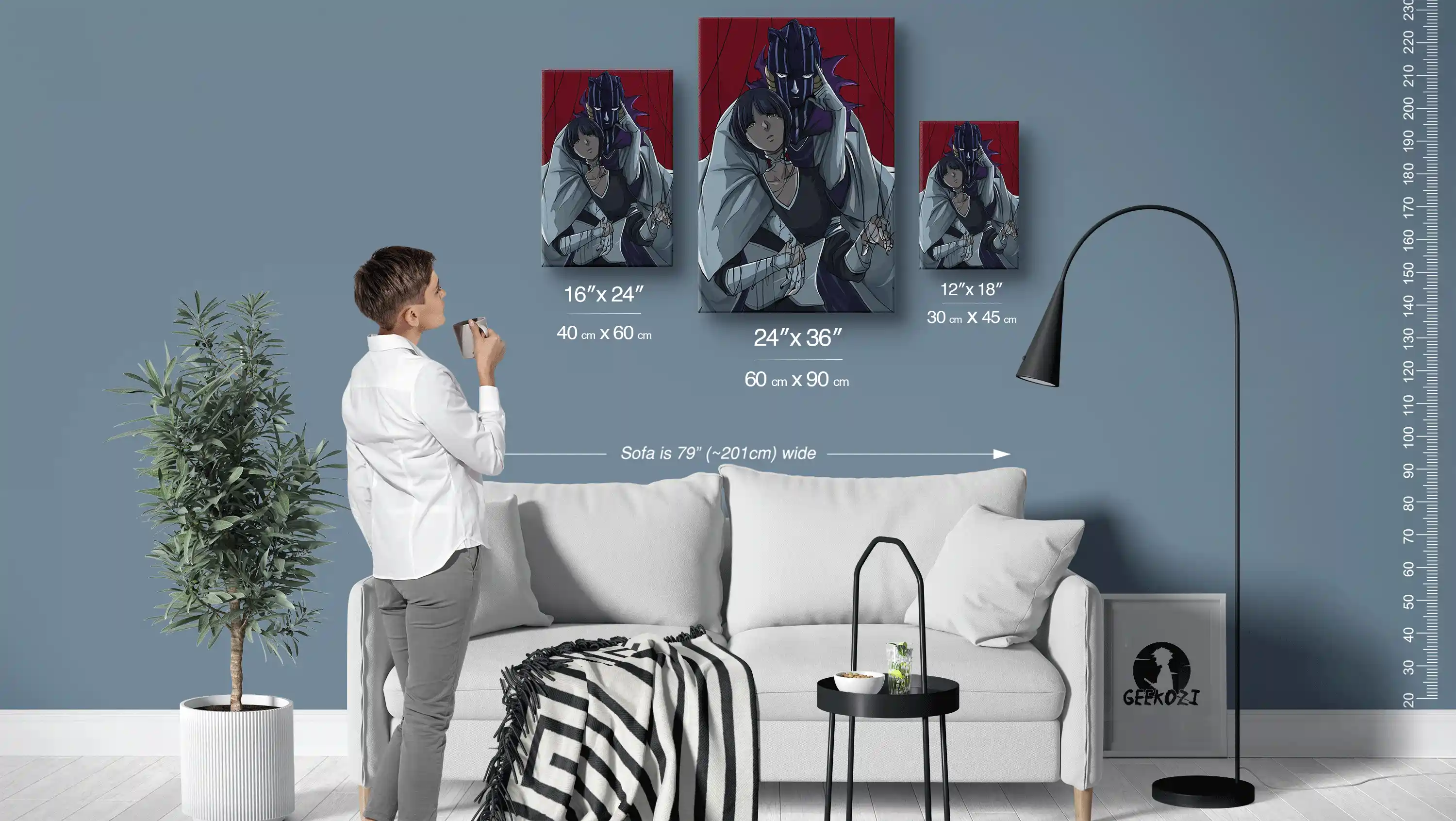 Experience the captivating allure of Sinister Strings and Masked Gaze, available in three striking sizes: 12″×18″ (30×45 cm), 16″×24″ (40×60 cm), and 24″×36″ (60×90 cm). The sofa in the image above measures 79 inches (approximately 201 cm) wide, giving you a clear sense of scale for each piece. For a cozy nook or desktop display, the smallest size works perfectly, while the largest option is ideal for creating a stunning feature wall that demands attention. Choose the size that best fits your space and enjoy the dramatic impact of your new artwork.