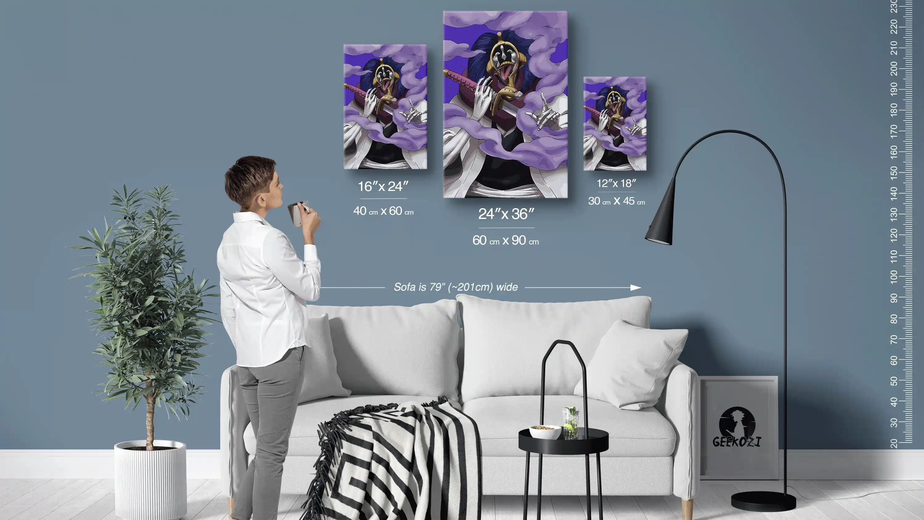 The Sinister Vapor and Masked Gaze artwork comes in three sizes to perfectly fit your space: 12″×18″ (30×45 cm), 16″×24″ (40×60 cm), and 24″×36″ (60×90 cm). Keep in mind that the sofa in the image above is 79 inches (approximately 201 cm) wide, which can help you visualize the scale of each piece. For a cozy desk setup, the smallest size works well, while the largest size makes a striking statement on a feature wall. No matter your choice, each piece adds a unique touch to your home decor.