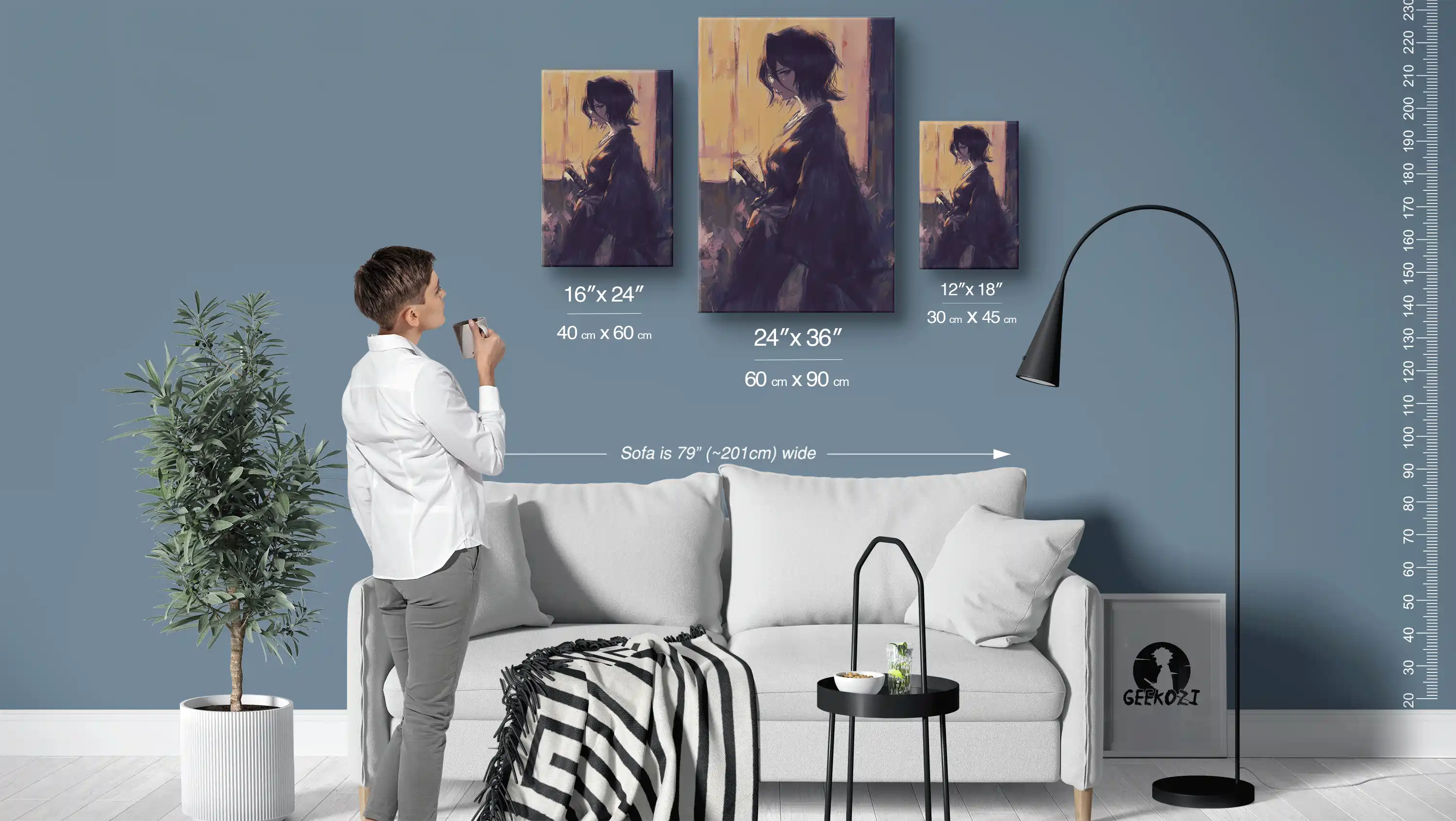 Geekozi’s stunning anime metal wall art comes in three versatile panel sizes: 12″×18″ (30×45 cm), 16″×24″ (40×60 cm), and 24″×36″ (60×90 cm). To give you an idea of scale, the sofa in the image above measures 79 inches (approximately 201 cm) wide, which can help you visualize how the artwork would look in your space. A simple tip for size selection is to consider the smallest panels for desks or smaller areas, while opting for the largest panels to create a striking focal point on a feature wall. Each size offers a unique way to showcase your love for anime in your home.