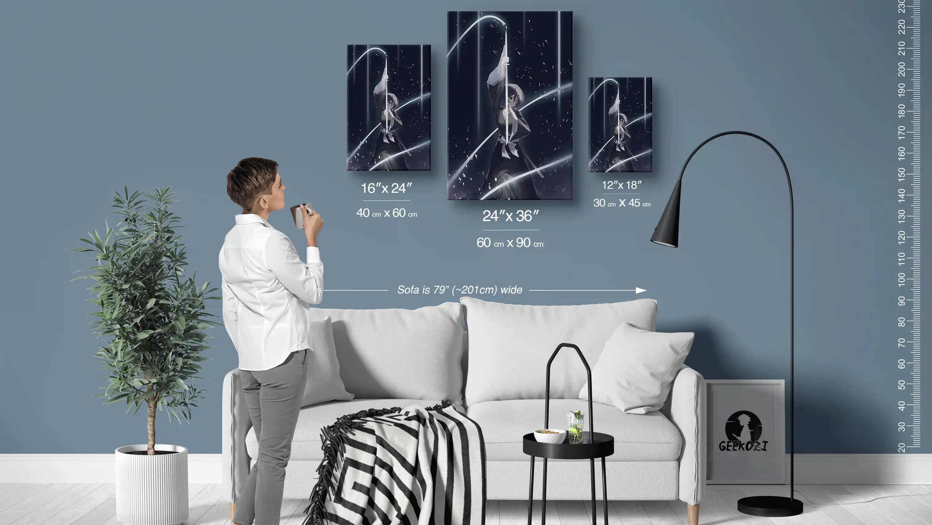 Transform your space with Geekozi’s stunning anime metal wall art, available in three versatile panel sizes: 12″×18″ for small spaces, 16″×24″ for medium areas, and 24″×36″ for making a bold statement. To give you a sense of scale, the sofa in the image above is 79 inches wide. If you’re looking to decorate a desk or a cozy nook, the smallest size works perfectly, while the largest size is ideal for creating a striking feature wall that draws attention. Choose the size that complements your room and expresses your passion for anime in style.