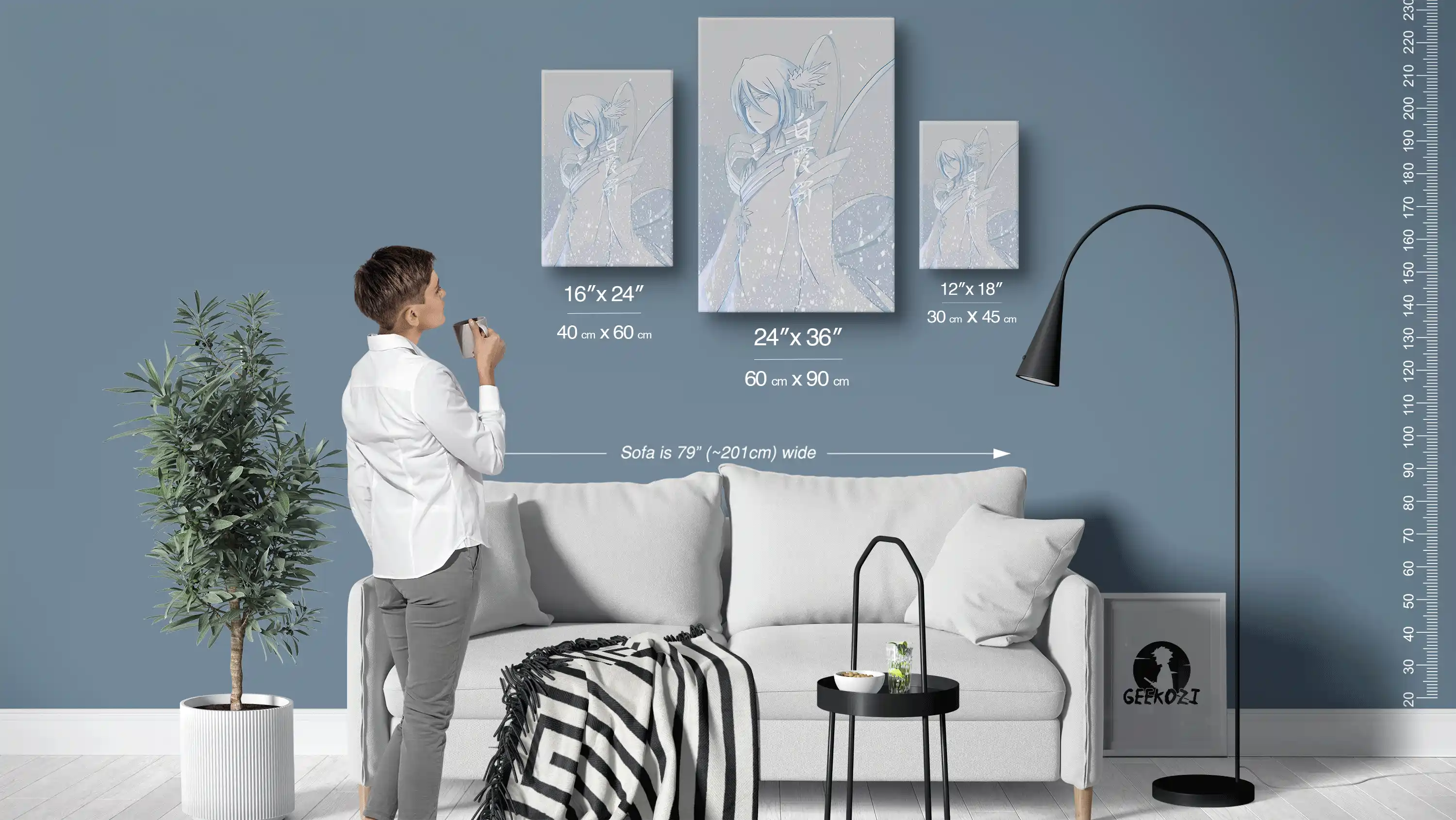 Geekozi’s premium anime metal wall art is available in three striking panel sizes: 12″×18″ (30×45 cm), 16″×24″ (40×60 cm), and 24″×36″ (60×90 cm). To give you a better idea of scale, the sofa in the image above measures 79 inches (approximately 201 cm) wide. When selecting the size, consider using the smallest panels for desks or side tables, while the largest options work beautifully as striking centerpieces on feature walls. Each piece not only brings your love for anime to life but also helps to create an incredible atmosphere in any room.