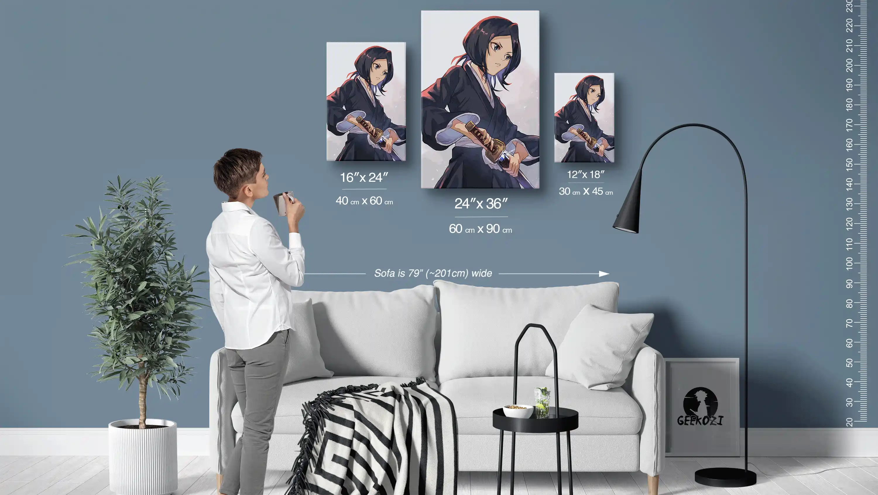 At Geekozi, our premium anime metal wall art is available in three sizes: 12″×18″ (30×45 cm), 16″×24″ (40×60 cm), and 24″×36″ (60×90 cm). To help you choose the right size, keep in mind that the sofa in the image above is 79 inches wide, which gives you a good reference for scale. For smaller spaces like desks or reading nooks, the 12″×18″ size works perfectly, while the largest 24″×36″ option is great for creating a stunning focal point on a feature wall. Each size offers a unique way to express your love for anime and enrich your space.