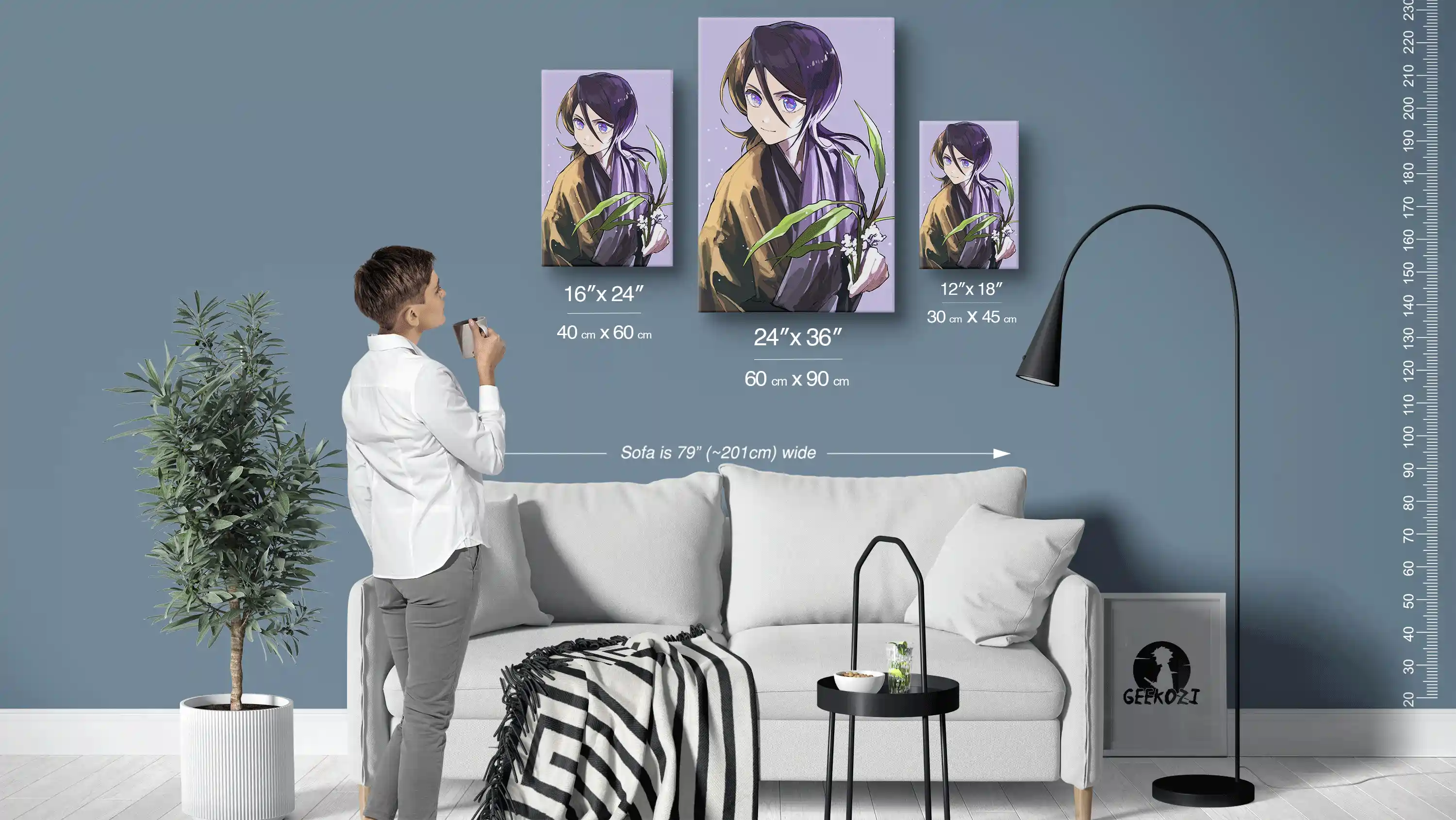 At Geekozi, our premium anime metal wall art is available in three sizes to fit any space: 12″×18″ (30×45 cm), 16″×24″ (40×60 cm), and 24″×36″ (60×90 cm). The sofa in the image above is 79 inches wide, which can help you visualize how each size would look in your home. A handy tip for choosing the right size is to consider your space; the smallest size is perfect for desks, while the largest size makes a striking statement on feature walls.