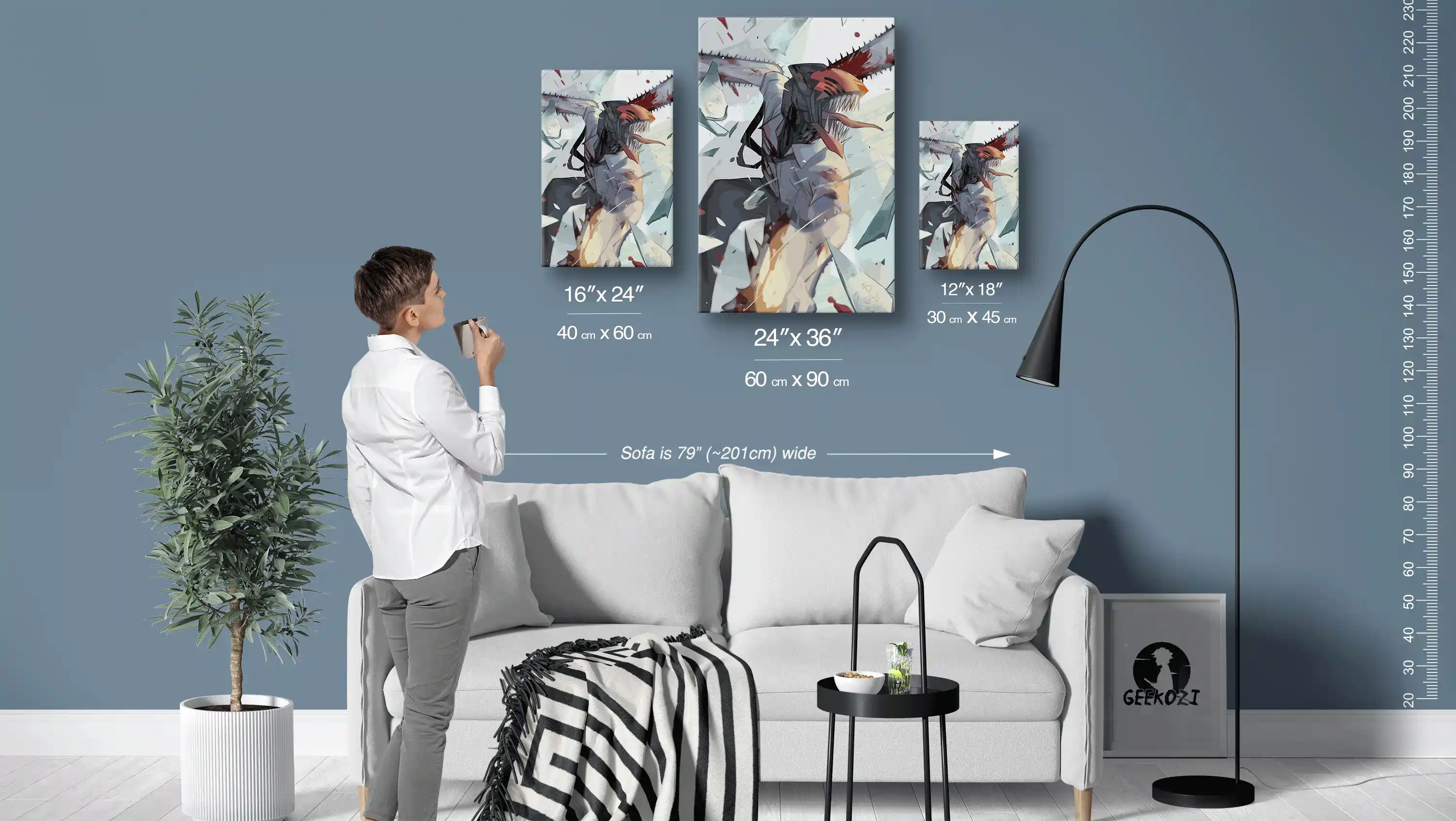 Transform your space with Geekozi’s stunning anime metal wall art, available in three panel sizes of 12″×18″ (30×45 cm), 16″×24″ (40×60 cm), and 24″×36″ (60×90 cm). The sofa in the image above measures 79 inches (approximately 201 cm) wide, giving you a great reference for scale. As a tip for choosing the right size, consider using the smallest size for desks or accent pieces, while the largest size makes a striking statement on feature walls. Find the perfect fit for your room and let your love for anime shine through your decor.
