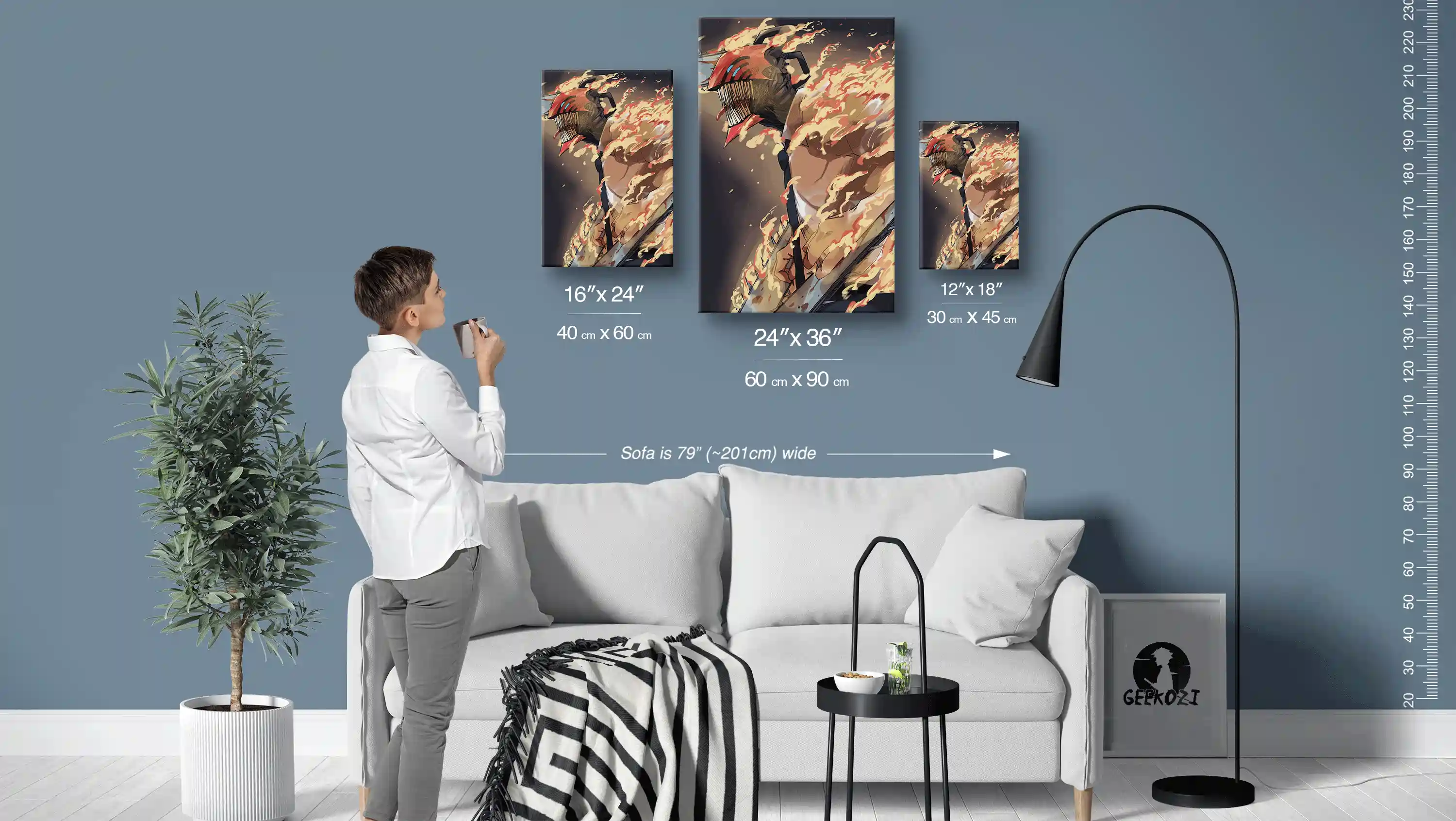 The Geekozi anime metal wall art comes in three versatile panel sizes: 12″×18″ (30×45 cm), 16″×24″ (40×60 cm), and 24″×36″ (60×90 cm). To help you visualize, the sofa in the image above is 79 inches (about 201 cm) wide, which can give you a sense of scale for your space. If you are looking to add a personal touch to a desk, the smallest size works beautifully, while the largest option makes a striking statement on feature walls. Choose the size that complements your décor and expresses your love for anime.