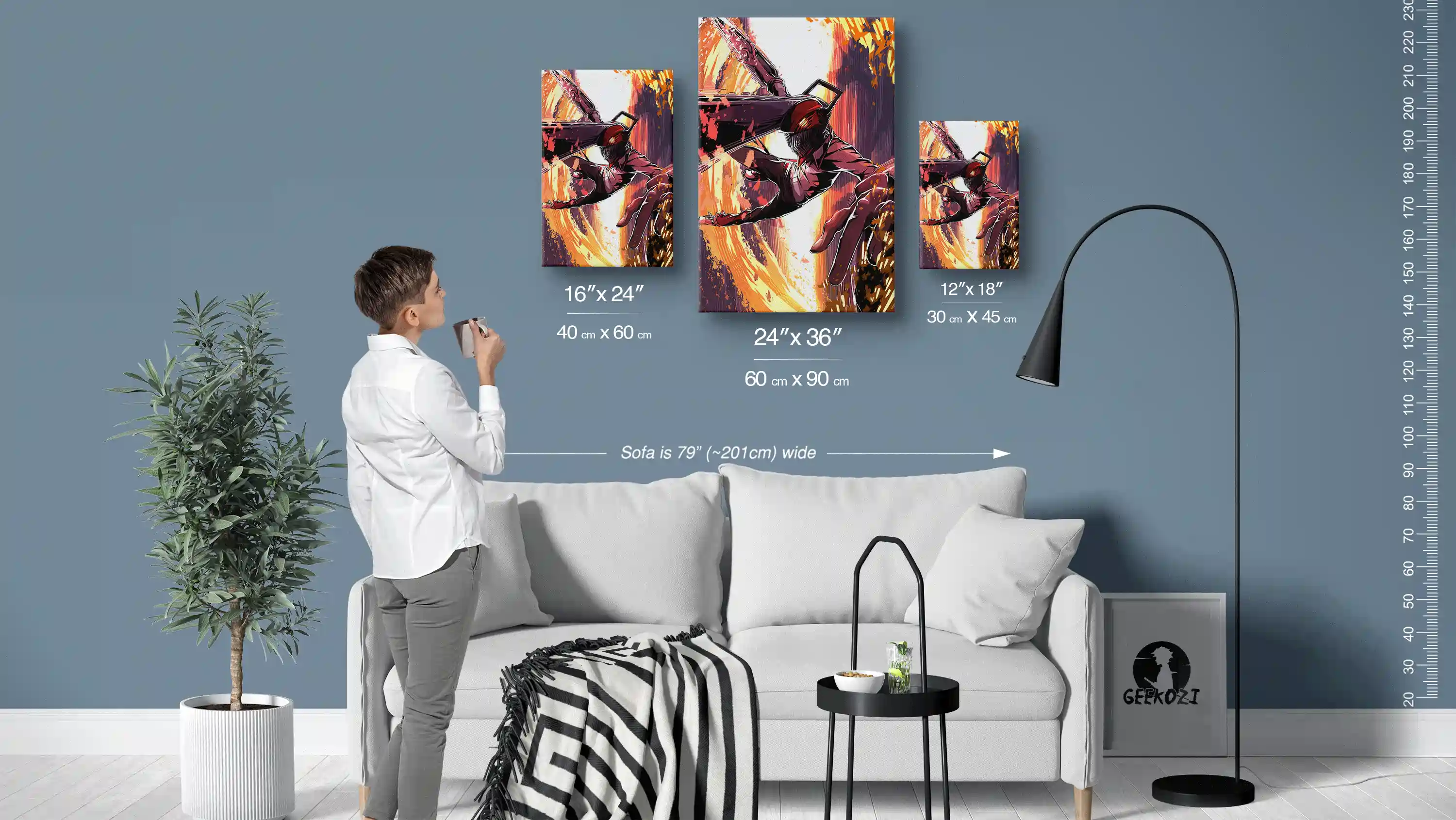 Our premium anime metal wall art comes in three sizes: 12″×18″ (30×45 cm), 16″×24″ (40×60 cm), and 24″×36″ (60×90 cm), making it easy to find the perfect fit for your space. The sofa in the image above is 79 inches (about 201 cm) wide, which can help you visualize how each size will look in your home. If you’re looking to add flair to a desk or smaller area, the smallest size is ideal, while the largest is perfect for making a bold statement on a feature wall. Choose the size that best fits your style and space requirements.