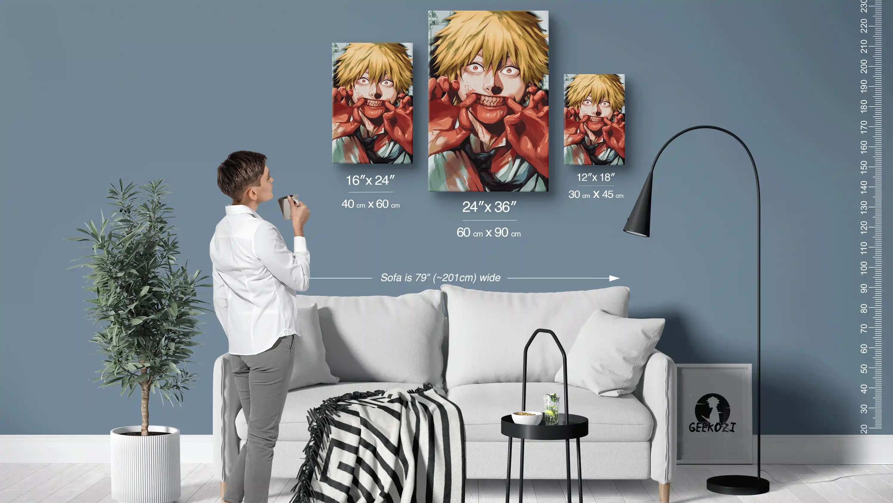 Geekozi’s premium anime metal wall art comes in three stunning panel sizes: 12″×18″ (30×45 cm), 16″×24″ (40×60 cm), and 24″×36″ (60×90 cm). To give you a sense of scale, the sofa in the image above measures 79 inches (about 201 cm) wide. When choosing the right size for your space, consider using the smallest size for desks or smaller areas, while the largest size makes a bold statement on a feature wall. No matter which size you choose, our art pieces will showcase your love of anime with style and flair.