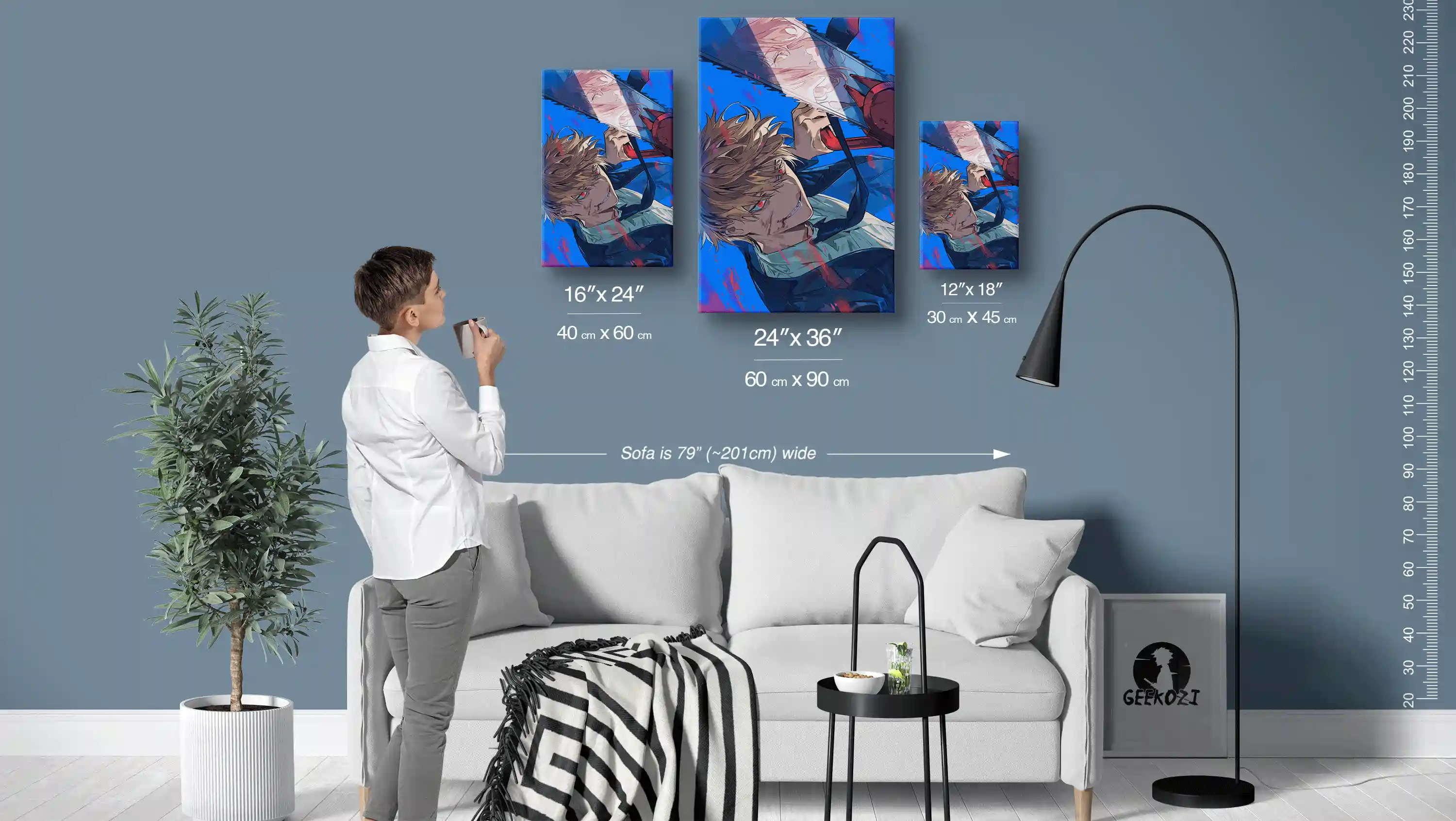 Transform your space with our stunning anime metal wall art, available in three sizes: 12″×18″ for cozy nooks, 16″×24″ for accent walls, and a grand 24″×36″ for making a statement. The sofa in the image above measures 79 inches wide, helping you visualize how each size fits into your room. For a desk or small area, the smaller panel is ideal, while the largest is perfect for creating a striking feature wall that draws the eye. Choose the size that best reflects your style and complements your existing decor.