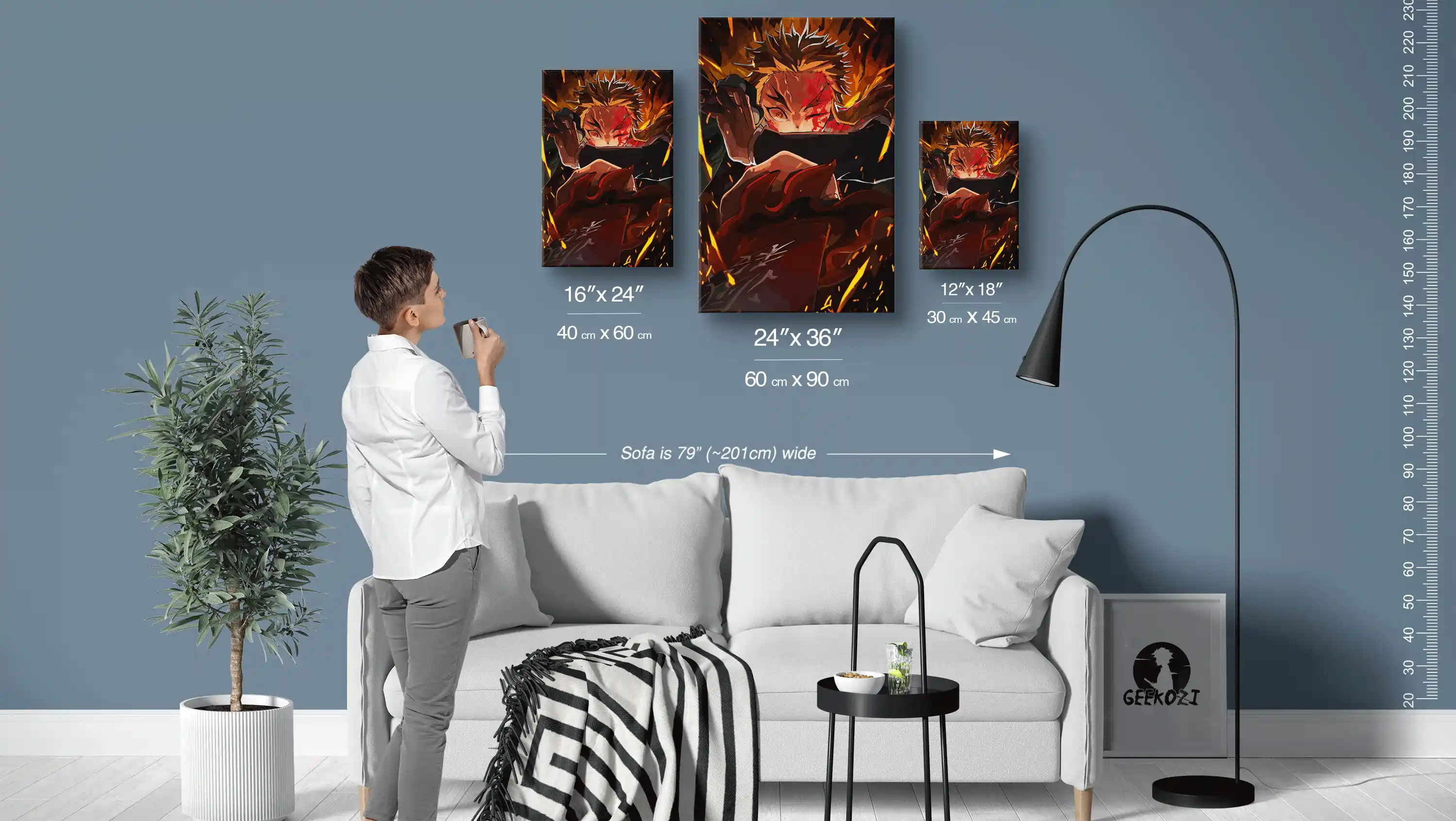 The Fiery Blade Amid Rising Flames is an eye-catching piece that comes in three sizes: 12″×18″ (30×45 cm), 16″×24″ (40×60 cm), and 24″×36″ (60×90 cm). To help you visualize, the sofa in the image above is 79 inches (approximately 201 cm) wide. If you’re looking to adorn a desk or small area, the smallest size may be best, while the largest option is perfect for making a statement on a feature wall. Choose the size that complements your space and highlights your unique style.