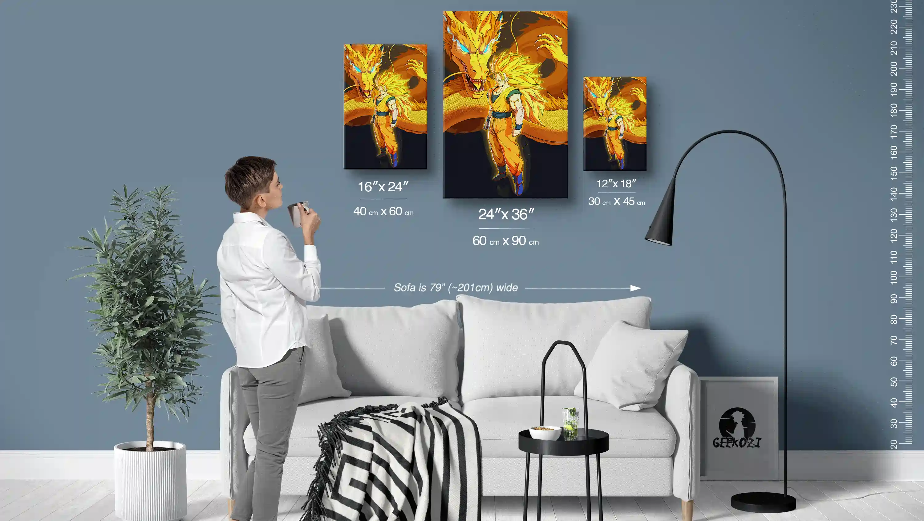 Anticipation Swirls Around Super Saiyan brings your favorite anime moment to life with stunning wall art available in three panel sizes: 12″×18″ (30×45 cm), 16″×24″ (40×60 cm), and 24″×36″ (60×90 cm). To help you visualize the piece, the sofa in the image above measures 79 inches (≈201 cm) wide, offering a good reference for scale. When choosing a size, consider placing the smallest panel above a desk for a personal touch, or opt for the largest option to make a bold statement on your feature wall. Each size captures the dynamic energy and essence of your favorite characters, creating a captivating look in any space.