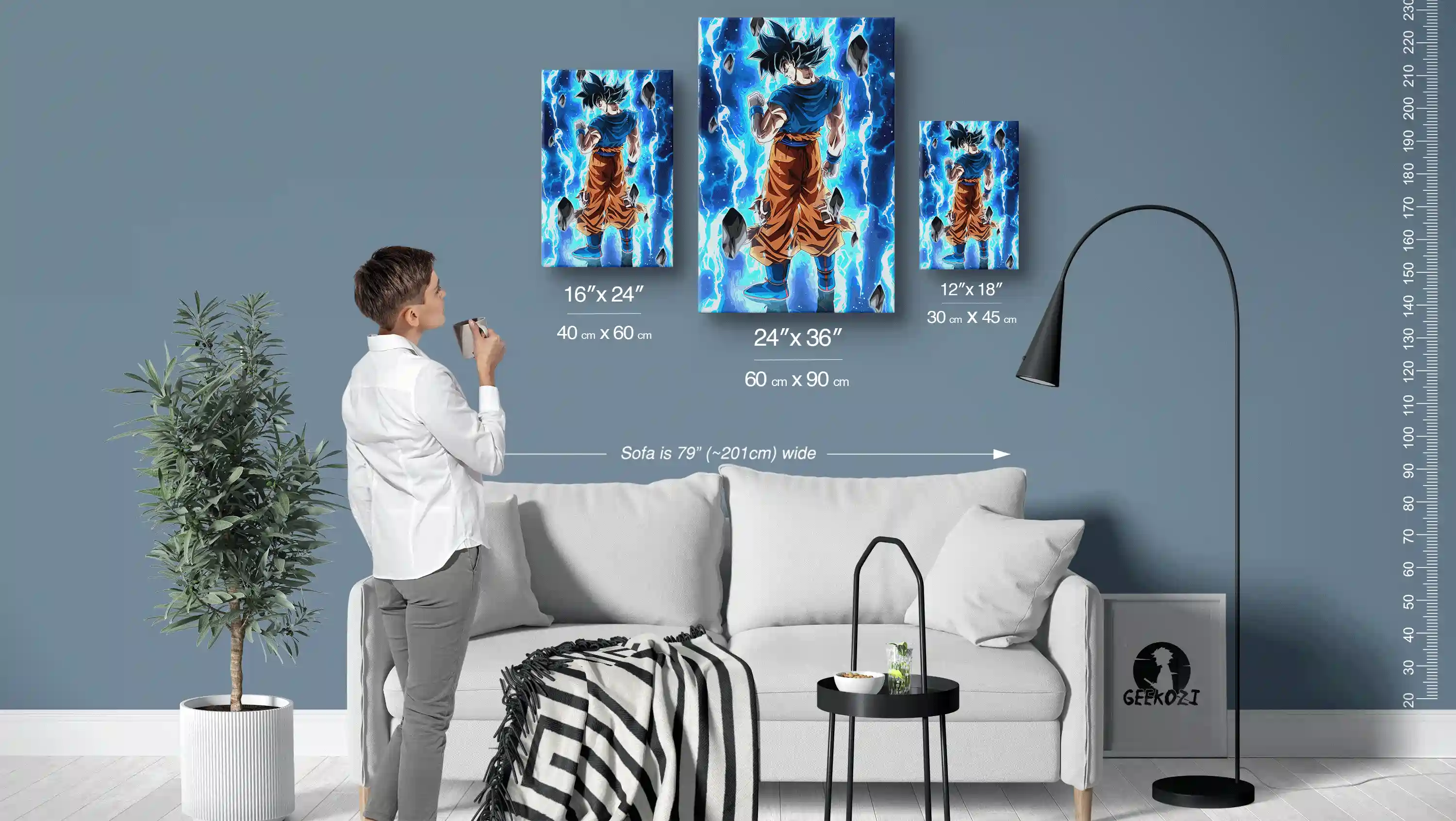 The Blazing Aura Fighting Pose is an eye-catching piece that brings energy to any space with its dynamic design. Available in three sizes—12 inches by 18 inches, 16 inches by 24 inches, and 24 inches by 36 inches—there’s a perfect fit for every room. To help you visualize, the sofa in the image above measures 79 inches wide, which gives you a sense of how the art will look in proportion to your furniture. For smaller spaces like desks, the 12-inch by 18-inch option works well, while the 24-inch by 36-inch size makes a striking statement on larger feature walls.