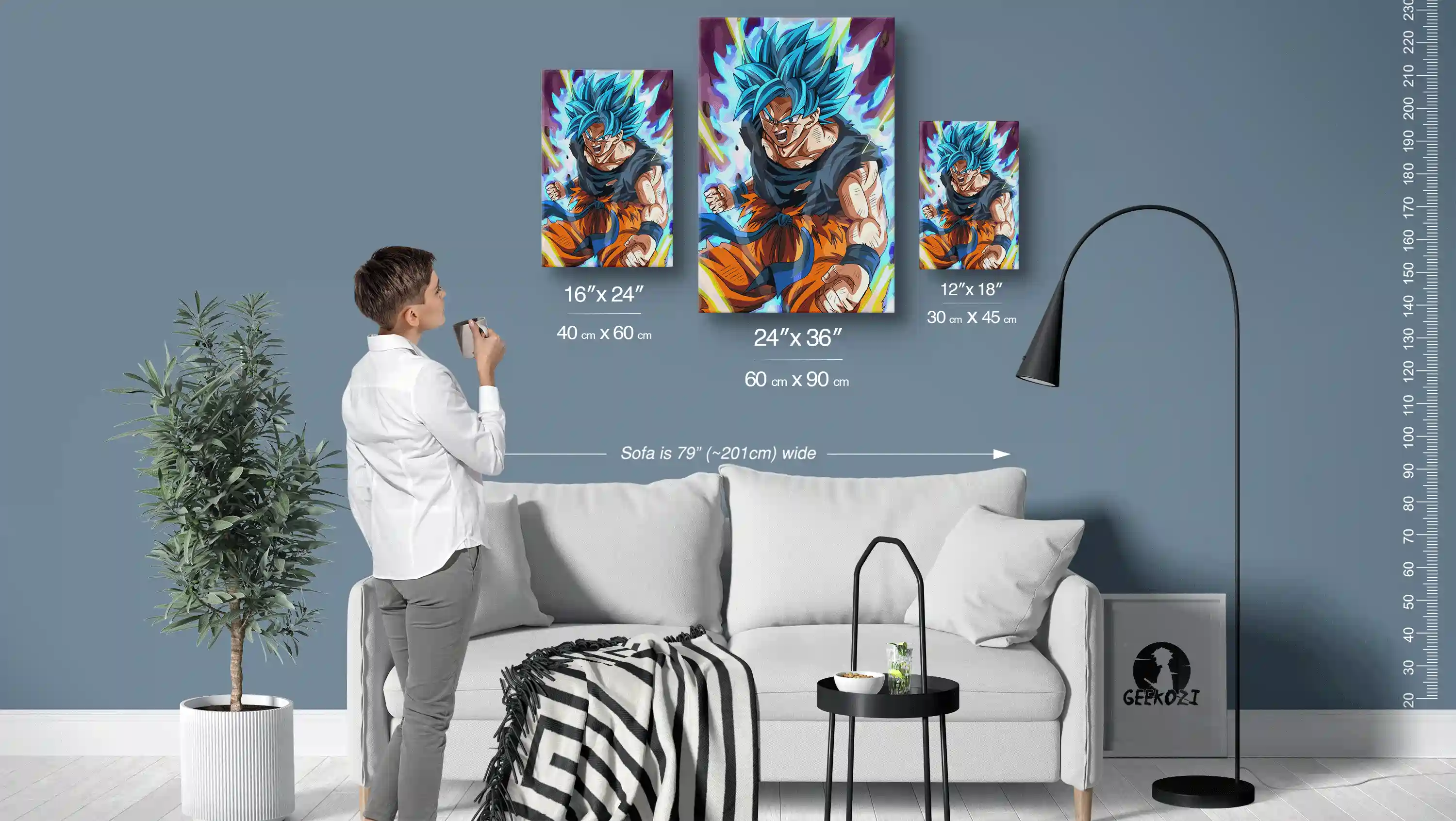 The Electrifying Blue Aura Battle is a stunning addition to any space, available in three panel sizes: 12″×18″ (30×45 cm), 16″×24″ (40×60 cm), and 24″×36″ (60×90 cm). To help you visualize the scale, the sofa in the image above is 79 inches (approximately 201 cm) wide. For smaller spaces like desks, the 12″×18″ size works well, while the largest option is perfect for creating a striking focal point on feature walls. Choose the size that best suits your area and enjoy the captivating energy this artwork brings.