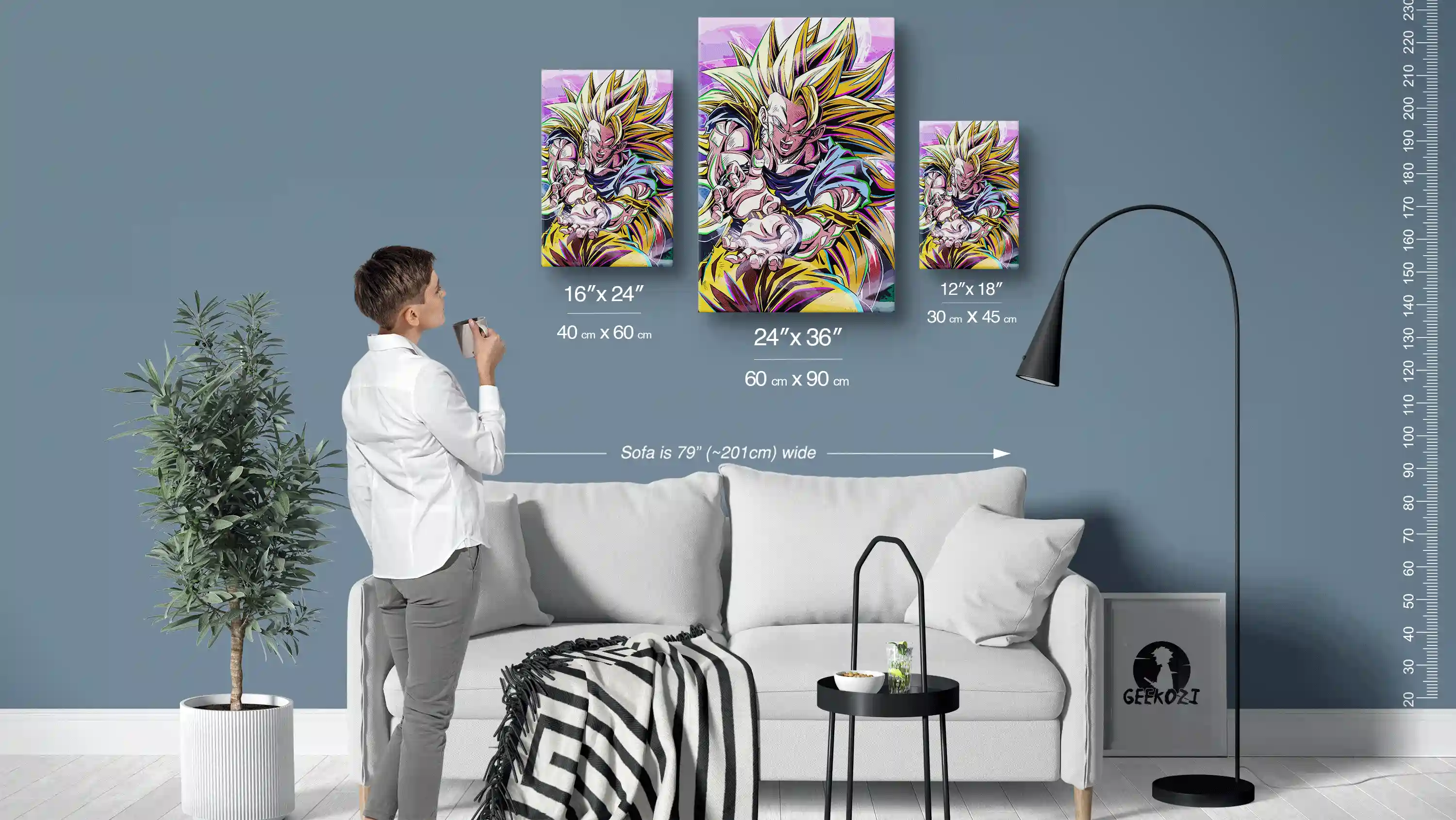 Transform your space with the Explosive Kamehameha Energy Burst, available in three stunning panel sizes: 12″×18″ (30×45 cm), 16″×24″ (40×60 cm), and 24″×36″ (60×90 cm). To help you visualize, the sofa in the image above measures 79 inches (approximately 201 cm) wide. If you’re looking to add a dynamic touch to a desk or smaller area, the smaller size works perfectly, while the largest size is ideal for creating a striking feature wall that demands attention. Choose the size that best suits your space and let the art energize your surroundings.