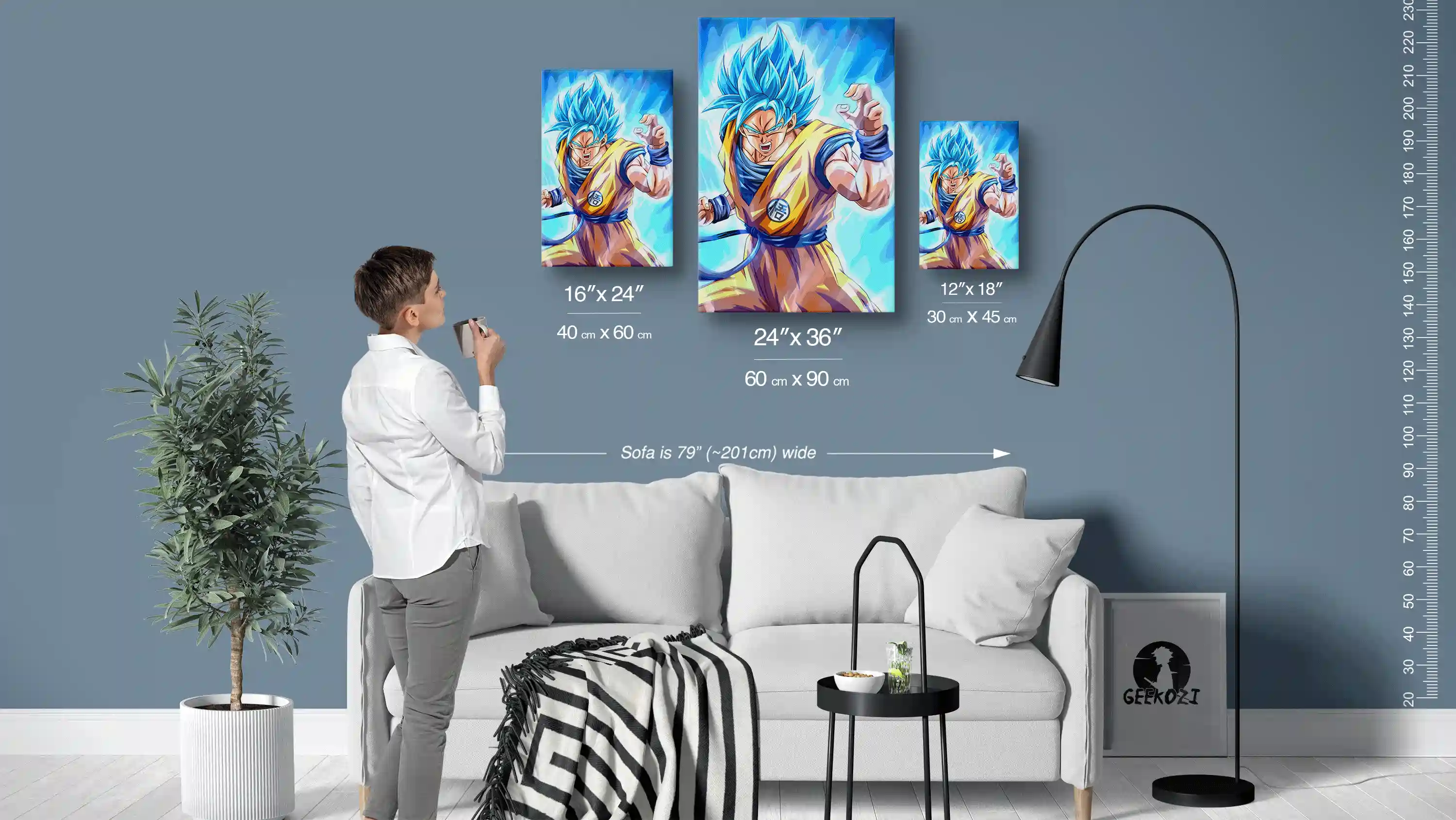 Transform your space with the Radiant Blue Aura Transformation, available in three striking panel sizes: 12″×18″ (30×45 cm), 16″×24″ (40×60 cm), and 24″×36″ (60×90 cm). To help you visualize the perfect fit, keep in mind that the sofa in the image above measures 79 inches (approximately 201 cm) wide. If you’re looking to add a touch of flair to a small desk, the smallest size is ideal, while the largest option makes a bold statement on feature walls, drawing attention and creating an eye-catching focal point in any room.