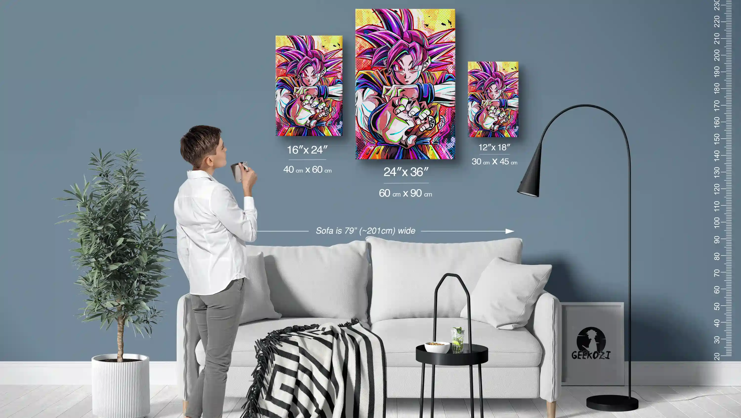 The Radiant Kamehameha Power Up is an impactful piece that can transform your space. Available in three sizes—12″×18″ (30×45 cm), 16″×24″ (40×60 cm), and 24″×36″ (60×90 cm)—it offers versatility to suit various settings. For reference, the sofa in the image above is 79 inches (approximately 201 cm) wide, which can help you visualize the scale. A good tip for choosing the right size is to consider where you’ll hang it: go for the smallest option for desks and the largest for striking feature walls. Each size showcases the dynamic energy of the artwork in a way that fits perfectly with your decor.