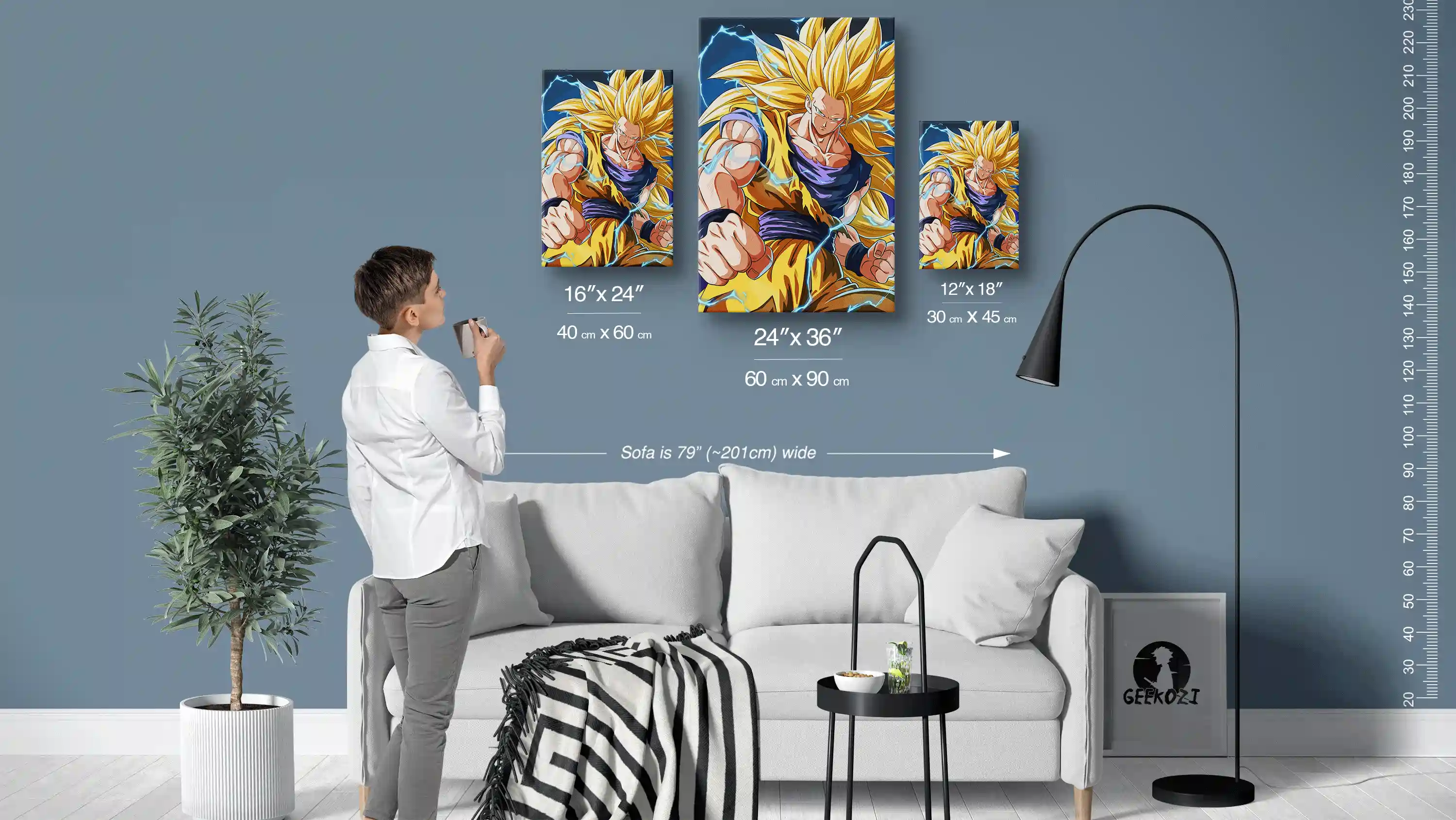 The Radiant Super Saiyan 3 Transformation wall art is available in three stunning panel sizes: 12″×18″ (30×45 cm), 16″×24″ (40×60 cm), and 24″×36″ (60×90 cm). To help you visualize, the sofa in the image above measures 79 inches (approximately 201 cm) wide, which can assist you in determining how each size will fit in your space. For smaller areas like desks or bedrooms, the 12″×18″ size is perfect, while the 24″×36″ option works wonderfully as a focal point on larger feature walls. Choose the size that best matches your decor to make the artwork shine.