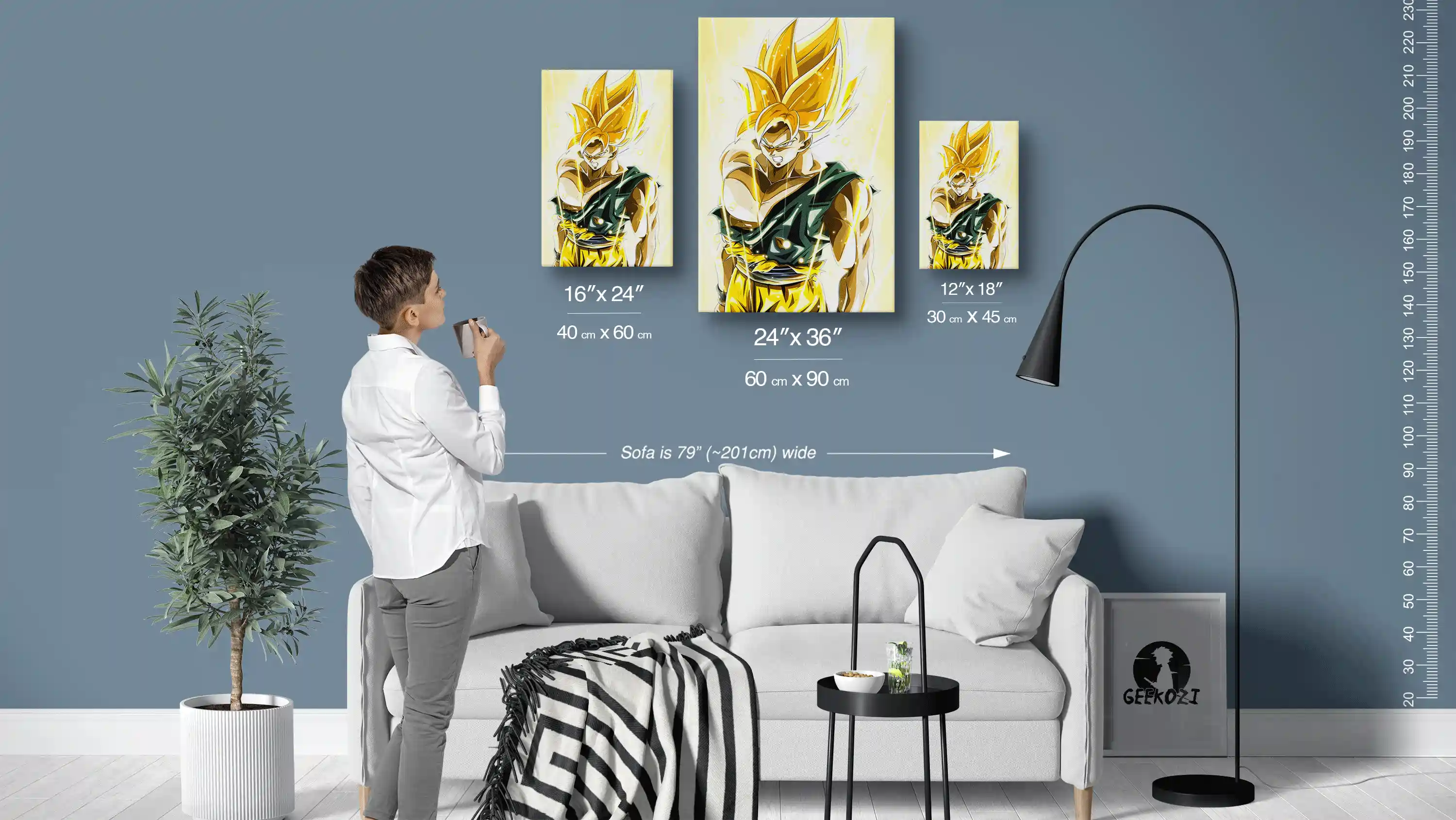 Elevate your space with our stunning Radiant Super Saiyan Ascension, available in three striking panel sizes: 12″×18″ (30×45 cm), 16″×24″ (40×60 cm), and 24″×36″ (60×90 cm). To help you visualize, the sofa in the image above is 79 inches wide, giving you a good sense of scale. For a cozy desk setup, the smallest size works perfectly, while the largest panel makes a bold statement on feature walls. Choose the size that best fits your room and personal style to make an impactful display.