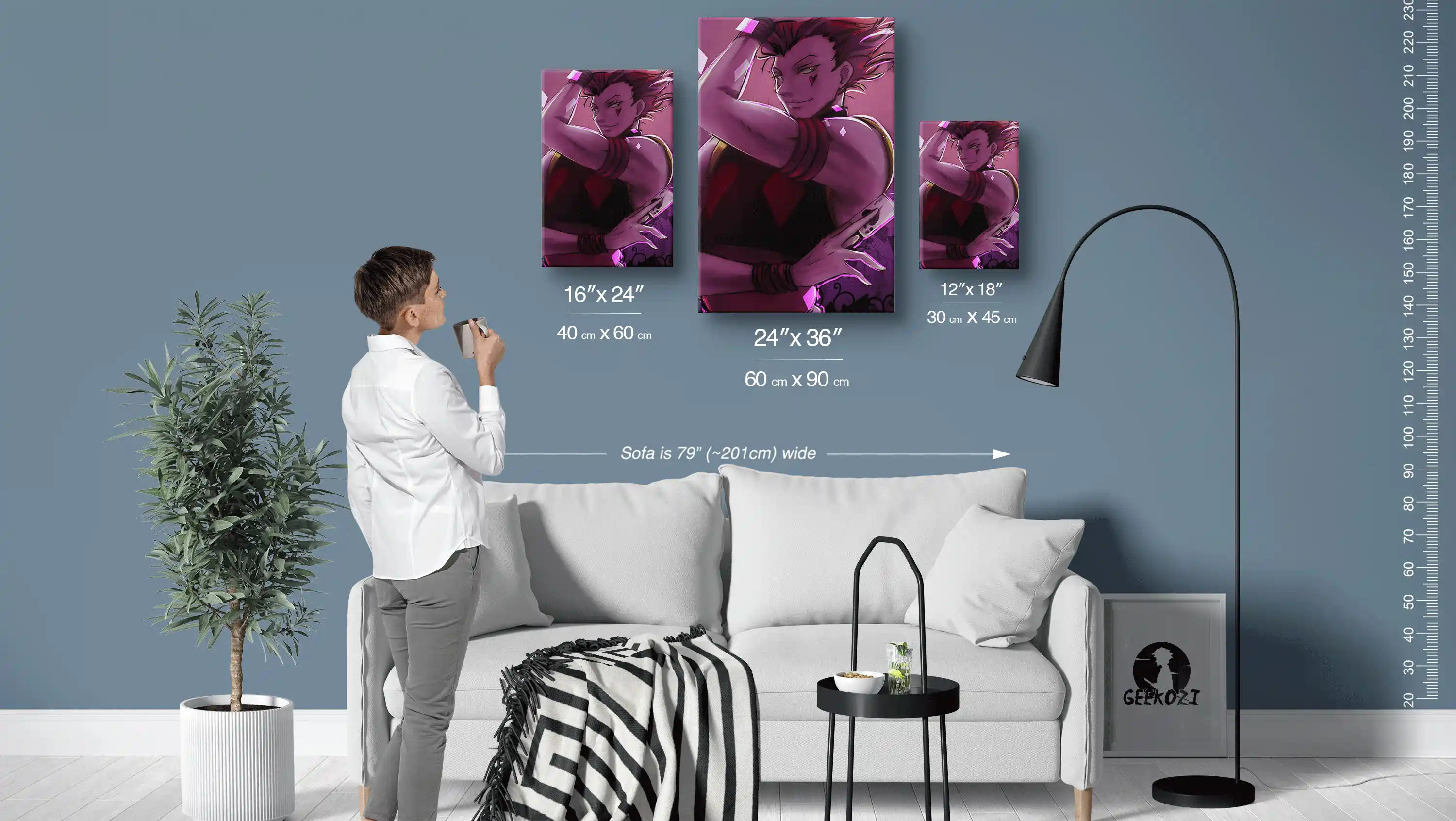 The Electric Playing Card Pose is a striking piece for any space, available in three panel sizes: 12″×18″ (30×45 cm), 16″×24″ (40×60 cm), and 24″×36″ (60×90 cm). The sofa in the image above is 79 inches wide, which should help you visualize how each size will fit in your room. For smaller areas like desks or side tables, the 12″×18″ panel is ideal, while the larger 24″×36″ option can serve as a captivating focal point for feature walls. Choose the size that best complements your decor and personal style.