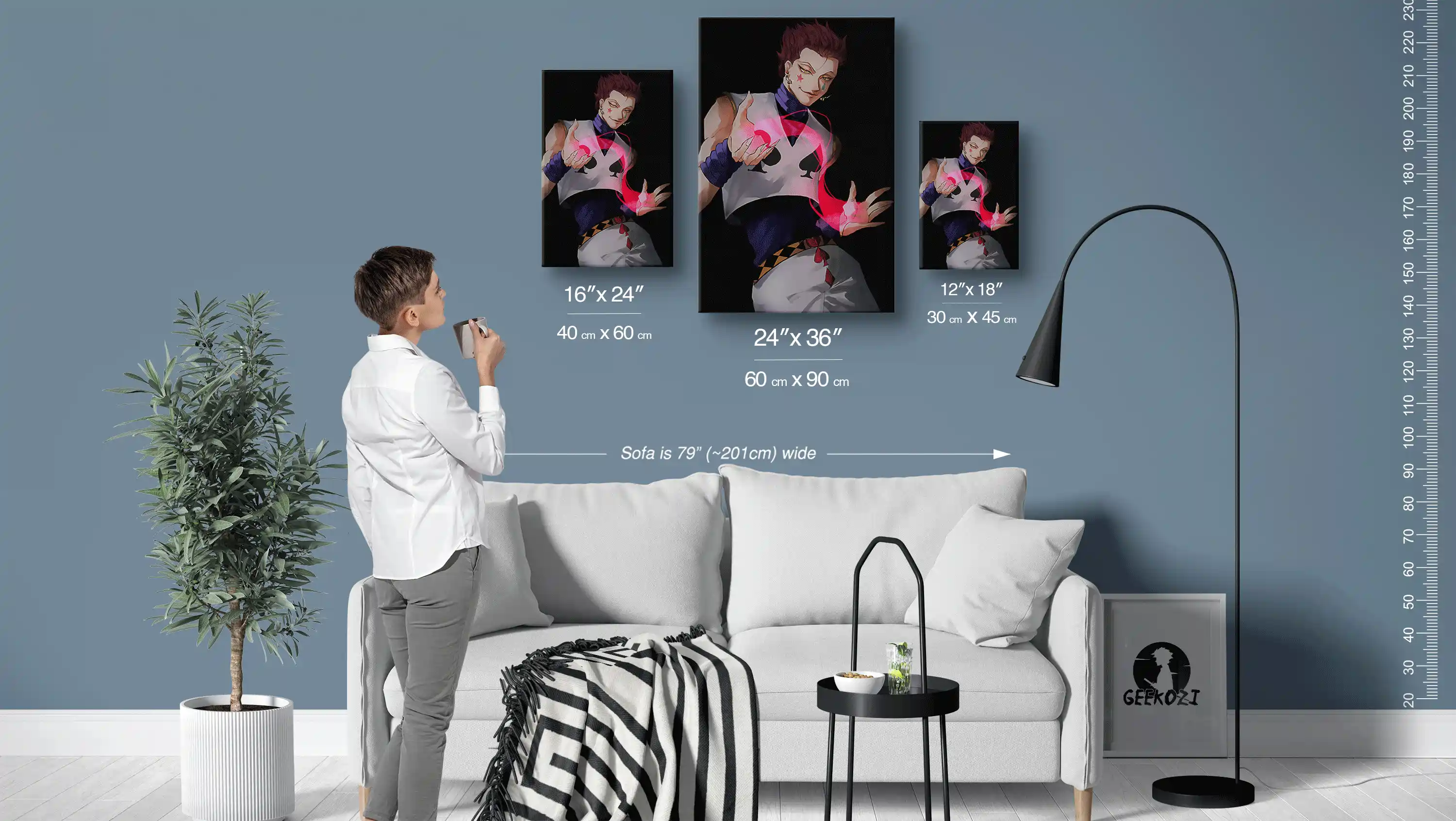 Transform your space with our Enigmatic Aura and Bungee Gum wall art, available in three stunning sizes: 12″×18″ (30×45 cm), 16″×24″ (40×60 cm), and 24″×36″ (60×90 cm). The sofa in the image above is 79 inches wide, giving you a clear idea of how each size will look in your home. For smaller areas like desks or cozy nooks, the 12″×18″ is a perfect fit, while the 24″×36″ size can create a striking focal point on a feature wall. Choose the size that resonates best with your space and style for a captivating addition to your decor.